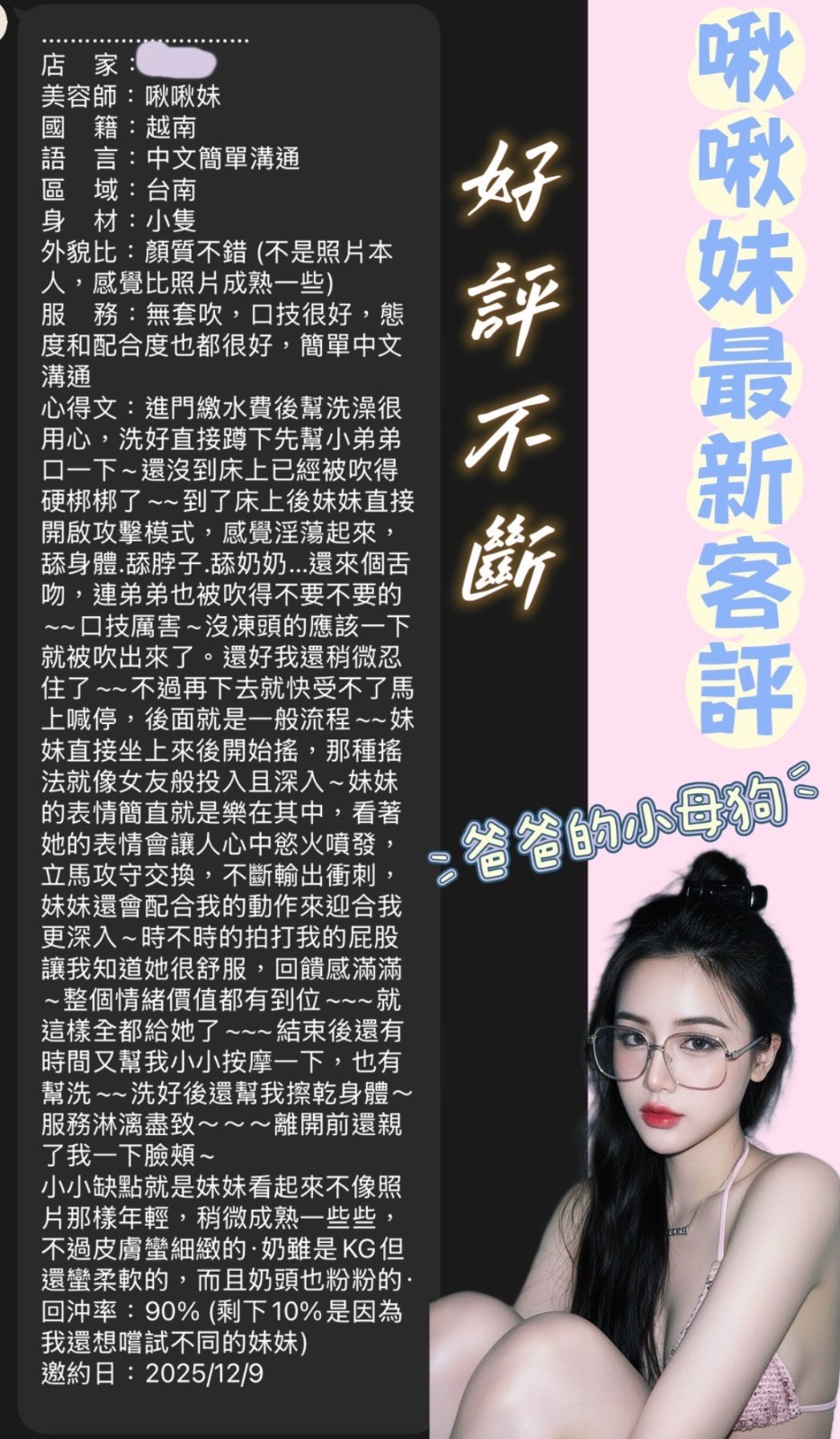 服務項目:共浴/無套吹/舌吻(視口腔清潔)/小親親/按摩/乳交/足交/舔蛋舔睪丸/舒麻舌功/品鮑/69/角色扮演(性感內衣)…