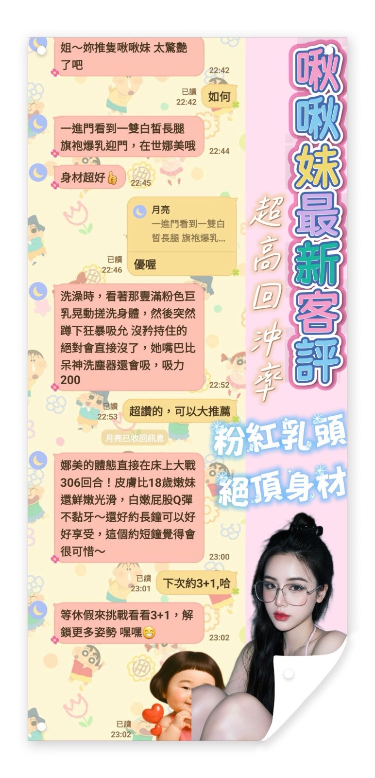 服務項目:共浴/無套吹/舌吻(視口腔清潔)/小親親/按摩/乳交/胸推/臀推/舔蛋/品鮑/69/角色扮演(性感內衣)…