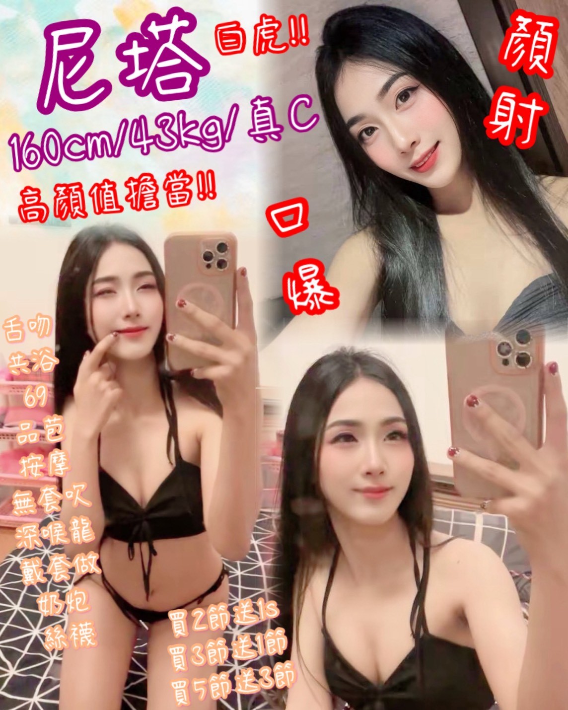 舌吻(視口腔衛生)/共浴/品鮑/69/按摩/奶炮/深喉嚨/無套吹/絲襪(客自備)/絲襪